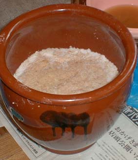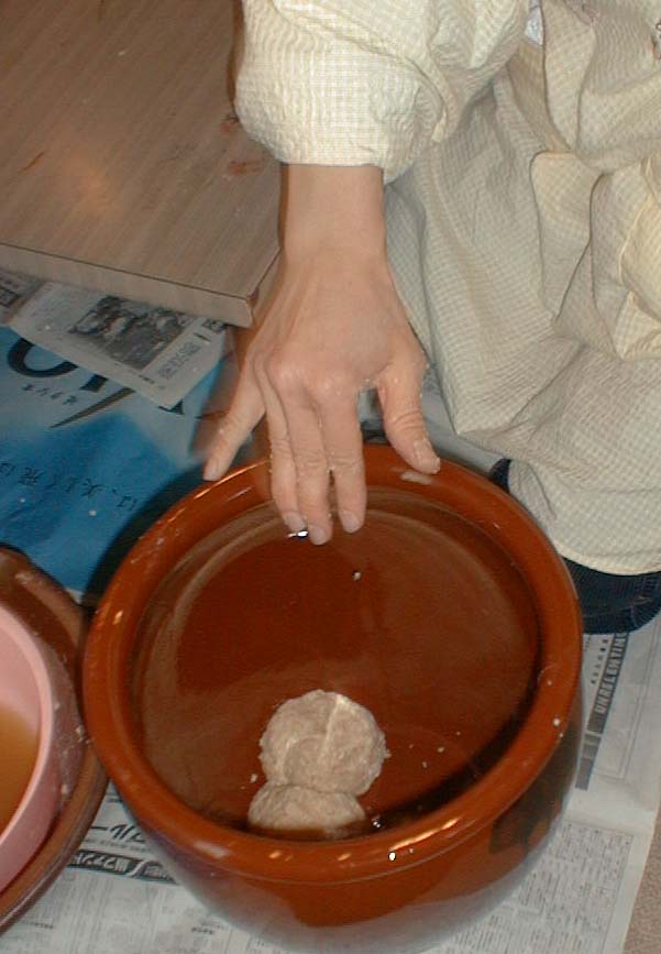 味噌でダンゴをつくり(直径10センチの球)、容器に押し詰める。