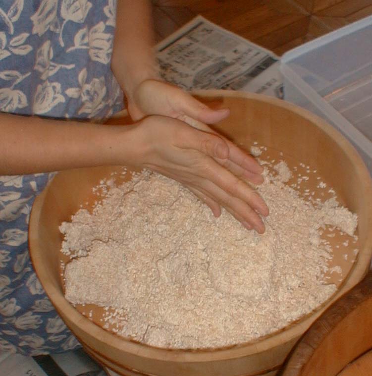 麹がかたまっていたら細かくくだき、塩と麹を手で混ぜ合わせます「しおきりこうじ」