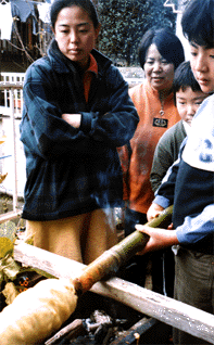 竹にケーキのタネをぬっては焼き、ぬっては焼き